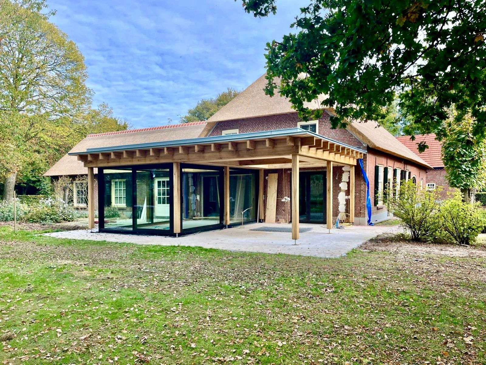 De eikenhouten constructie van de nieuwe tuinkamer en het overdekte terras staat inmiddels. De elektricien heeft de leidingen in het plafond gelegd en volgende week is het zaak om het dak verder af te werken met kunststof dakbedekking en zink.