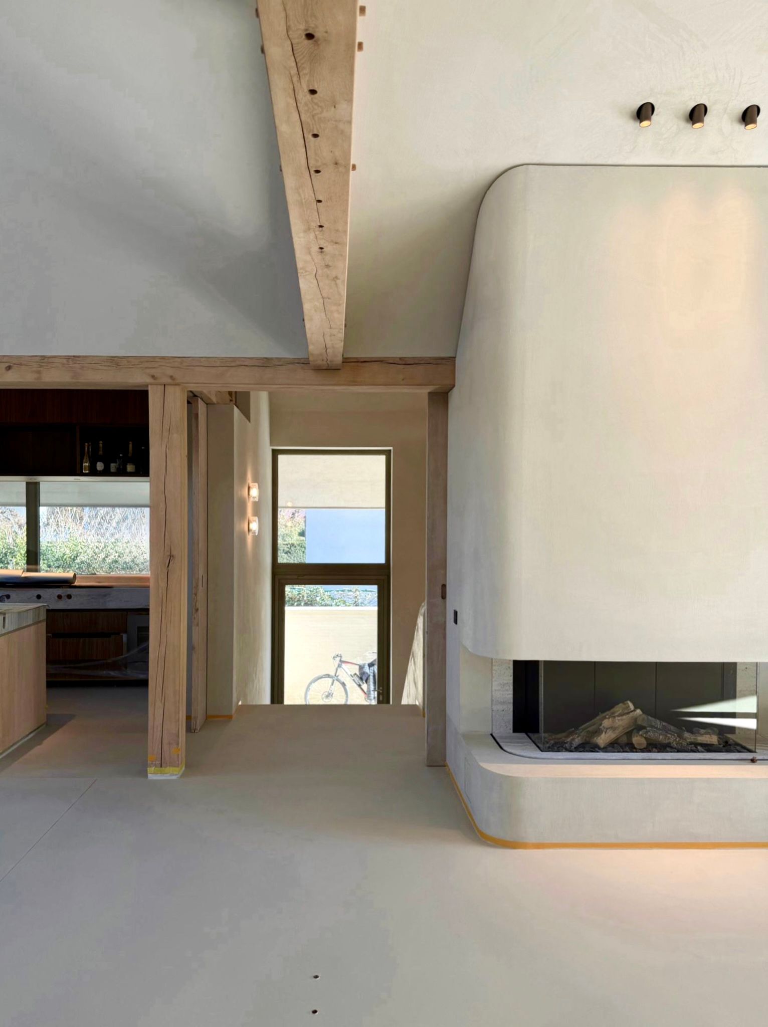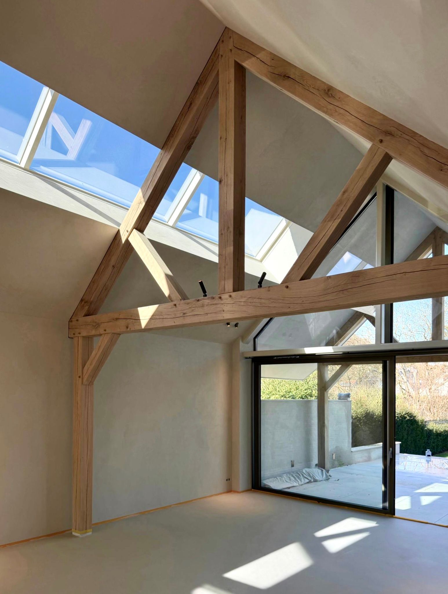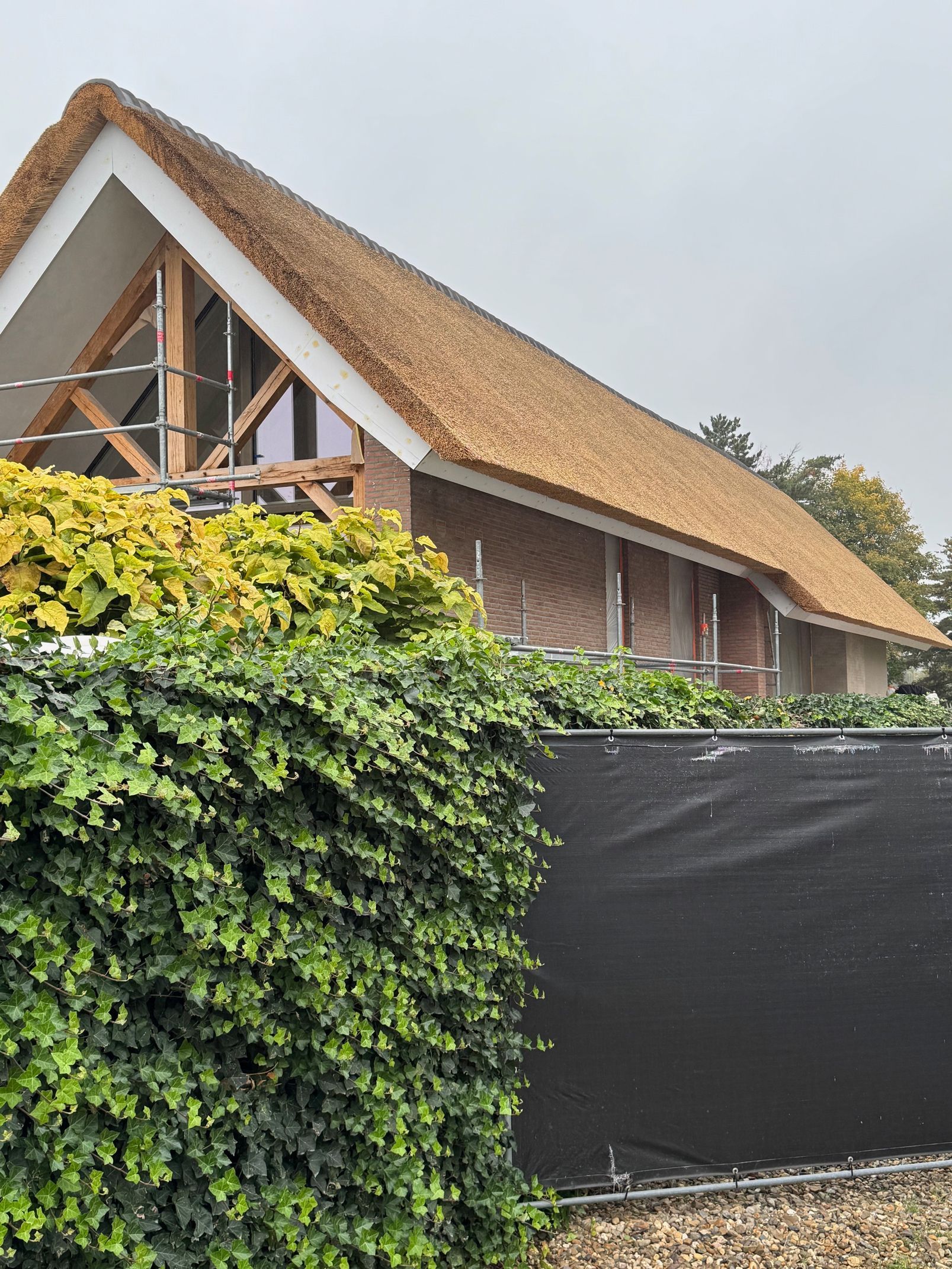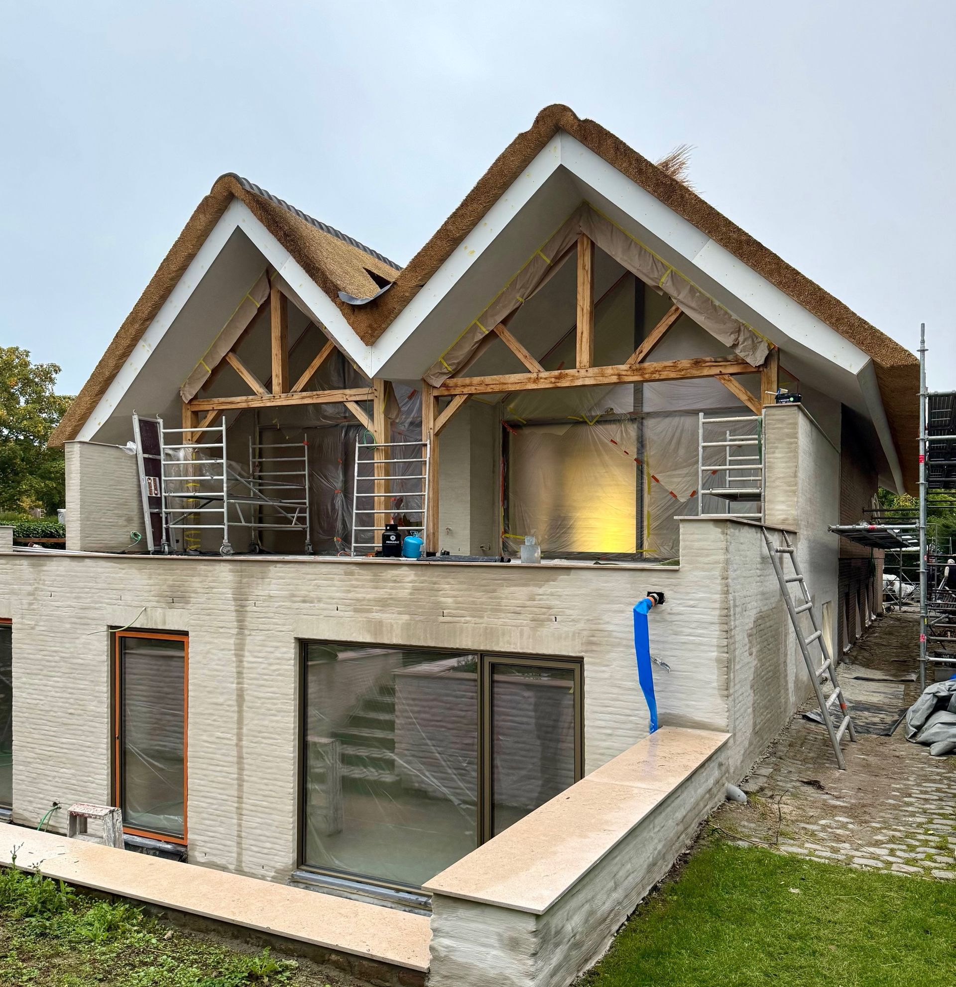 In deel van de woning in Kanne is reeds voorzien van kalkpleister (kaleien). Er is gekozen voor een lichtgrijs/beige toon waardoor het totaal, dus inclusief, eiken spanten, rieten dak en aluminium kozijnen (anodic bronze) zacht oogt. Ook in het interieur zullen deze kleurtonen terug te vinden zijn.r