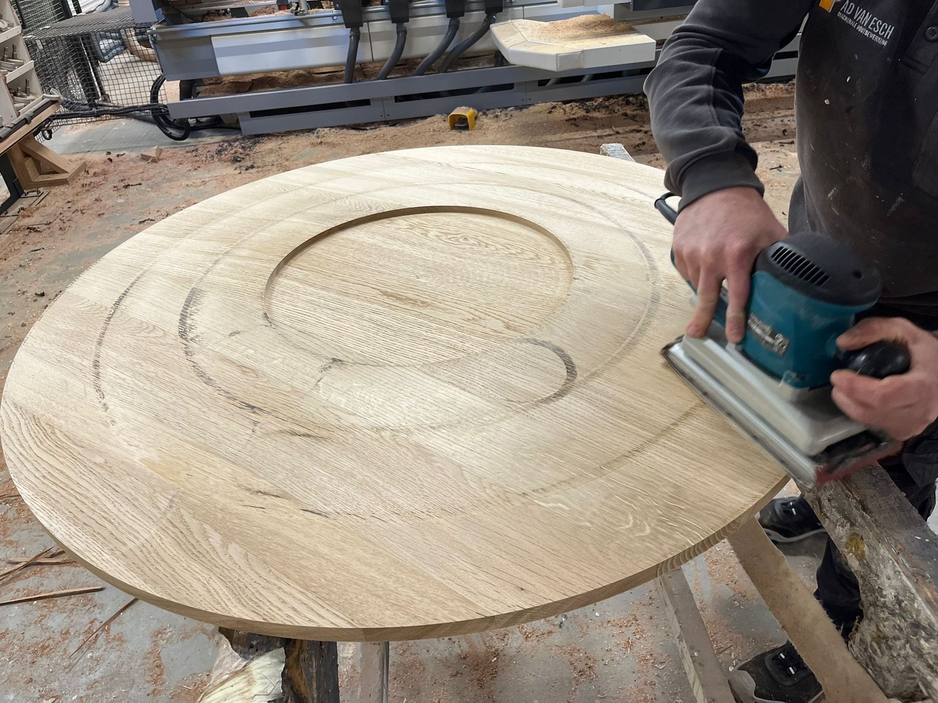Robuust Maatwerk is inmiddels bezig met de realisering van de bar (ontwerp WEA.) voor het nieuw te realiseren café aan de Oude Tweebergenpoort in Maastricht. Op de foto (foto: John Paulus) is het uit delen Moeraseik samengestelde barblad, in wording, te zien. De bar gaat een lengte hebben van ruim 5 1/2 meter en wordt naast het Moeraseik opgebouwd uit blank staal (geolied).
